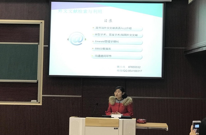 2017年4月27日上午8时,辅导员李晓晓老师在365英国在线体育MBA教室主持召开“学习外文文献检索与利用”活动,本次活动特邀到校图书馆咨询处魏小贞老师向同学们开展讲座。15级中美合作办学项目全体同学参加了此次活动。