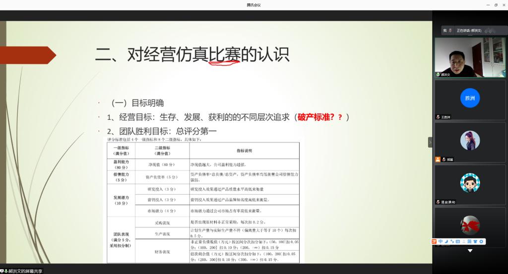 培训中,郝洪文老师以“是什么?怎么做?做成什么样?”为逻辑主线,依次就师生普遍关注的“什么是企业经营仿真竞赛”、“竞赛的操作要点”以及“模拟练习的目标”等问题进行细致讲解。郝老师特别强调,“大家要以战略思考为基础,以市场为发展线,以资本资源为约束线,以市场方案为原点,以研发、生产、采购、物流等运营体系为保障,形成经营比赛的思维要点与逻辑。”他建议参赛师生在赛前训练时可借助EXCEL或数学模型等工具来尝试打开企业经营决策的“黑箱”,以便更加科学的进行经营模拟。最后,王胜洲高度评价了郝洪文老师的精彩讲解,并对参赛人员提出明确要求,希望大家从认真研读竞赛规则开始,明晰思路、突出重点、稳扎稳打,为取得理想成绩做好充分准备。