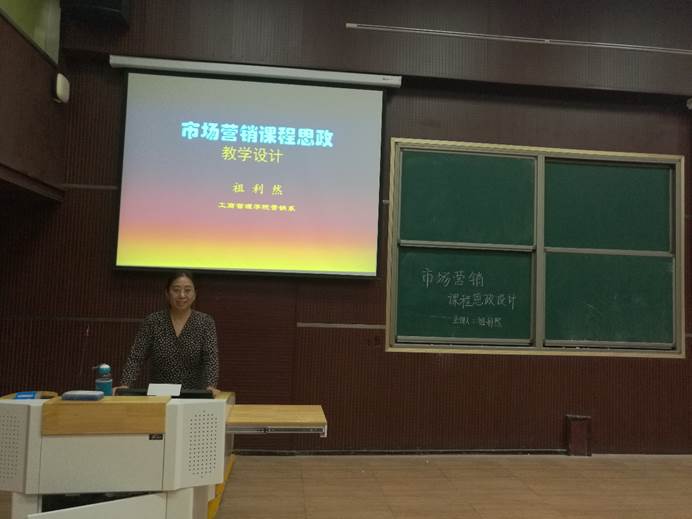 祖利然副教授结合专业,介绍了市场营销“课程思政”的目标、内容、原则和方法,认为首先在思想观念上要确立 “育人”目的,深入学习党的十九大精神,学习党和国家以及业务主管部门对应的经济、政治、文化、社会、生态或党建的相关理论,从中挖掘思政元素,进而结合专业课程谈思想、说素养、讲故事,把思政教育渗透进学习过程的每一环节,包括培养方案、教材选用、课前预习、课堂教学、课后作业、案例讨论、社会实践等方面。在将思政元素融入专业教学,运用马克思主义立场、观点和方法解释相关内容的同时,教师还要注重以德立身、以德立学、以德施教,为员工点亮理想的灯、照亮前行的路。最后,她以“宏观环境分析”一节为例,直观地展示了专业课程思政教学设计方案,并与参会的老师进行了深入讨论和交流。