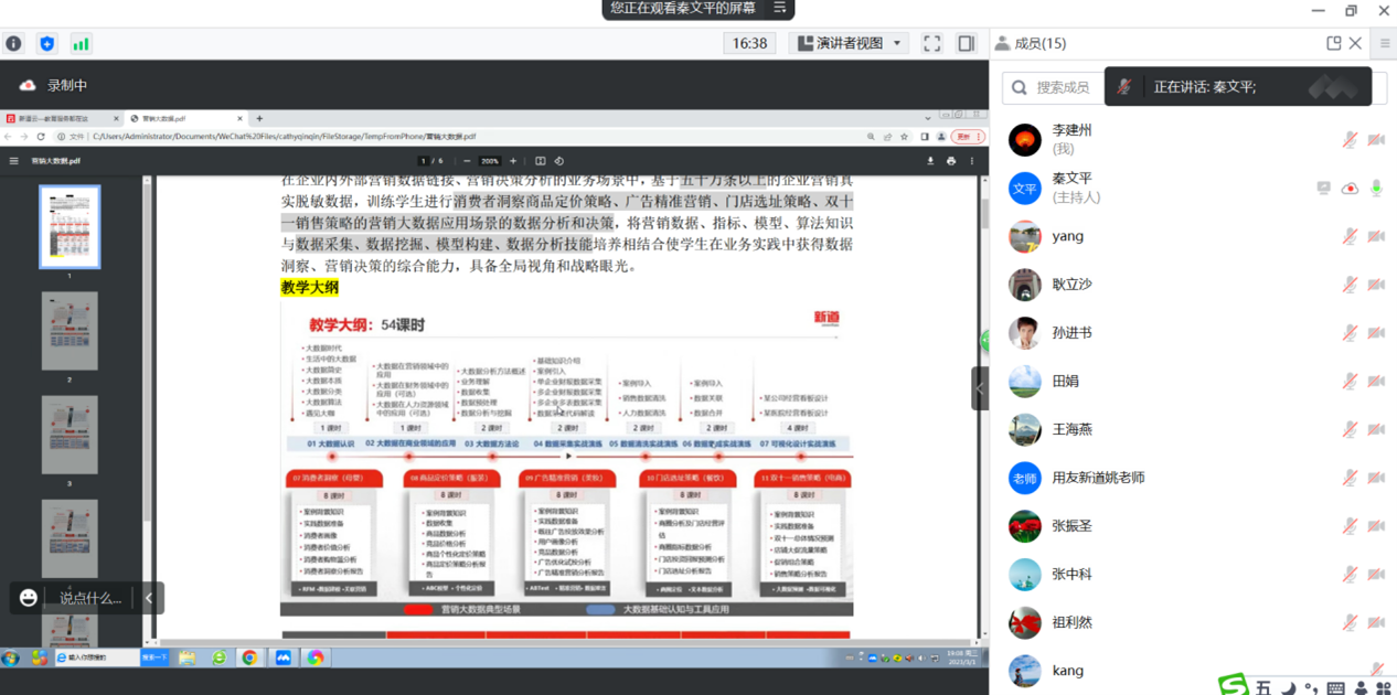 在两个小时的培训过程中,新道公司的两位培训老师对《营销大数据》的13个项目模块(大数据认知、大数据概述、大数据在商业领域中应用、大数据分析方法论、数据采集实战演练、数据清洗实战演练、数据集成实战演练、可视化设计实战演练、消费者洞察、商品定价策略、广告精准营销、门店选址策略)进行了详细讲解和操作演示。重点对数据清洗实战、数据集成和可视化设计三个部分进行了讲解。