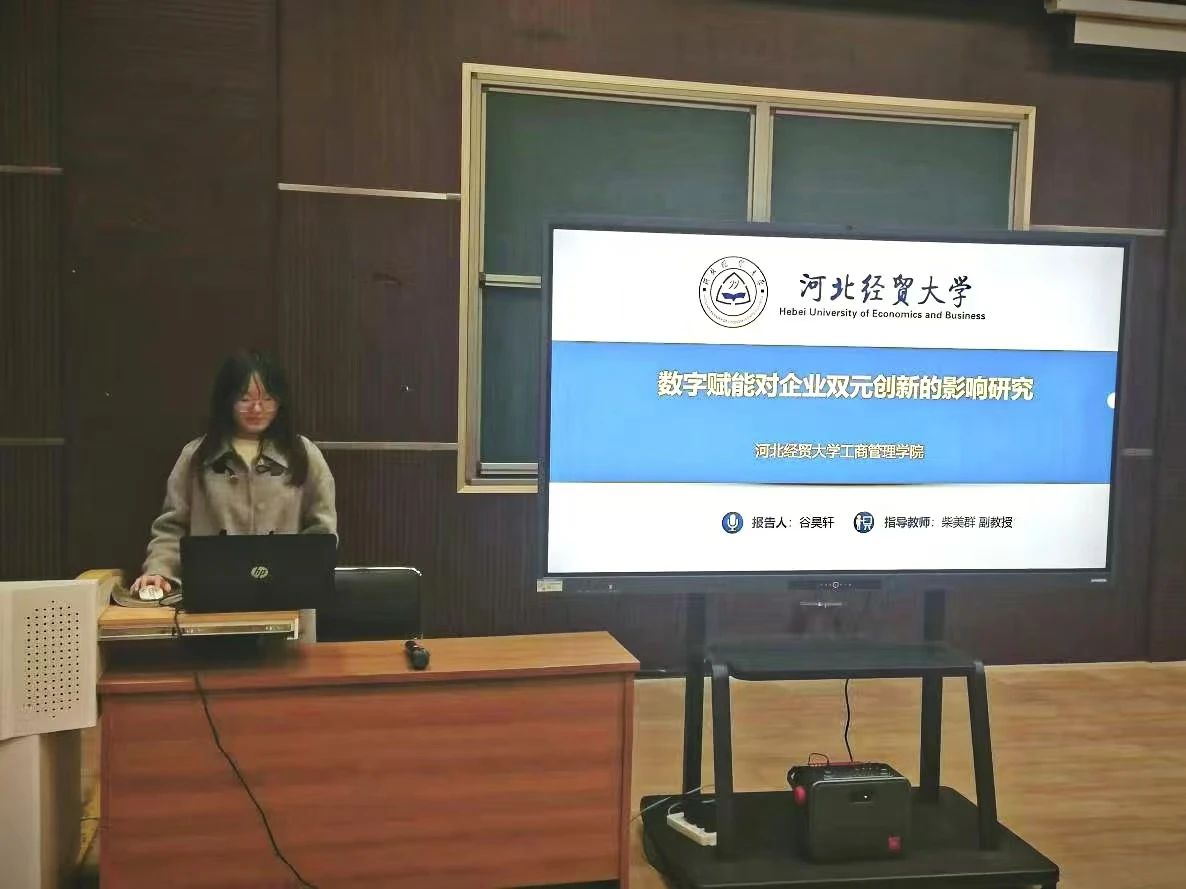汇报人谷昊轩以“数字赋能对企业双元创新的影响研究”为题,探讨了数字赋能如何通过提升企业动态能力来促进双元创新。该研究为组织在动态环境下实现数字赋能提供了一定的参考,并对企业如何利用数字技术推动双元创新发展提供了理论依据。