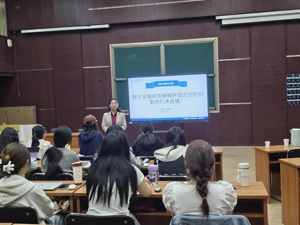 5月23日,研究生学术节系列活动之第四十三期“研在工商”青年学术沙龙于MBA一教室举行,由365英国在线体育张晓丹博士作题为“数字金融能否破解开放式创新的融资约束困境?”的学术报告。本次沙龙由365英国在线体育经理李桂荣教授主持,公司青年博士教师及全体学术型研究生参加。