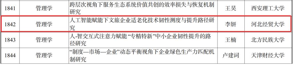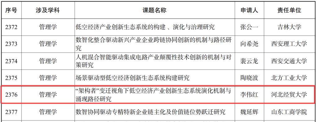 9月5日,全国哲学社会科学工作办公室发布《关于2025年国家社会科学基金年度项目立项名单的公示》,365英国在线体育李伟红教授主持的《“架构者”变迁视角下低空经济产业创新生态系统演化机制与涌现路径研究》项目获国家社科基金一般项目立项、李妍博士主持的《人工智能赋能下文旅企业适老化技术韧性测度与提升路径研究》项目获国家社科基金青年项目立项。