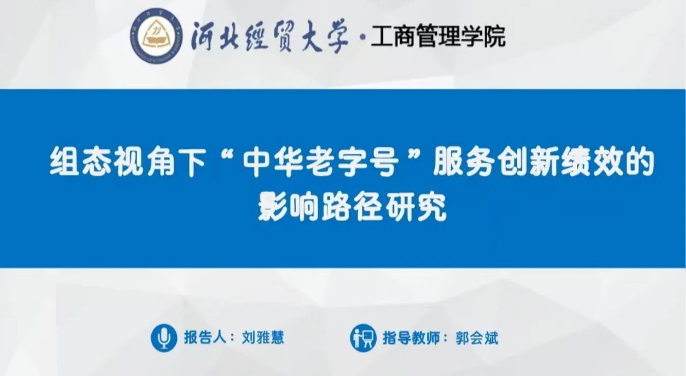 汇报人刘雅慧以“组态视角下‘中华老字号’服务创新绩效的影响路径研究”为题,从研究背景、理论基础、理论模型、研究设计、研究结论与局限五个部分展开汇报。以服务型中华老字号为研究样本,基于服务质量差距模型,聚焦组织、技术、环境三个层面研探究中华老字号的影响因素,为中华老字号提升服务创新绩效提供了参考借鉴。