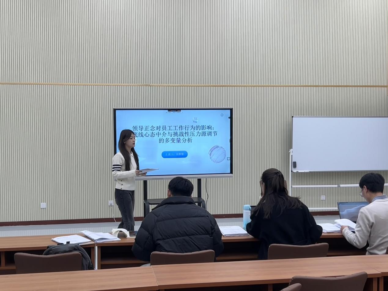 汇报人范雅馨以“领导正念对员工工作行为的影响:底线心态中介与挑战性压力源调节的多变量分析”为题,以中国内地四家企业为研究样本,从现实背景出发,数智化时代员工面临信息过载和任务复杂性,探讨领导正念对员工工作行为的影响,为有效激发企业员工活力提供了理论与实践启示。