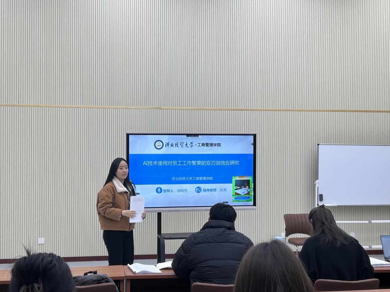 汇报人胡晓宇以“AI技术使用对员工工作繁荣的双刃剑效应研究”为题,从研究背景,研究目的与意义,研究假设,研究设计,实证分析与假设检验五个部分展开汇报。以使用AI技术的企业员工为研究样本,从情感反刍、问题解决沉思两个维度考察了AI技术使用对员工工作繁荣的影响,为企业更好理解和引入AI技术提供了实证证据。