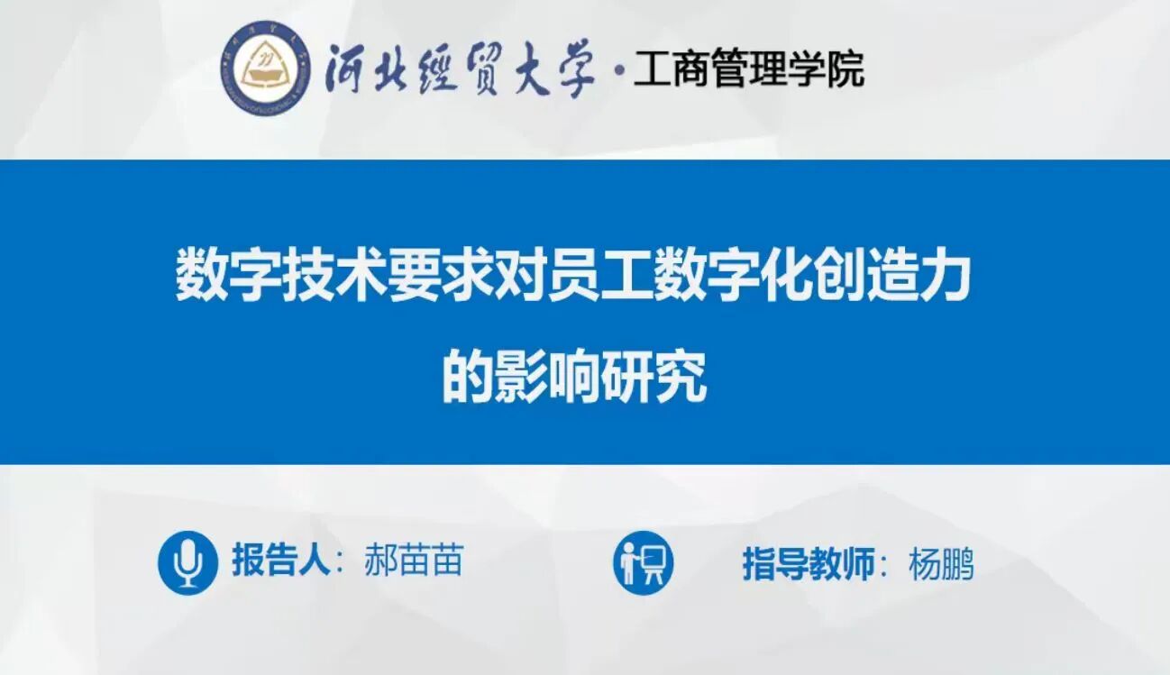 汇报人郝苗苗以“数字技术要求对员工数字化创造力的影响研究”为题,以制造业企业为研究样本,从工作自主性、自我领导力、组织创新氛围三个方面考察了数字技术要求对企业员工数字化创造力的影响,为理解数字技术要求在提升员工数字化创造力中的作用提供了实证依据。