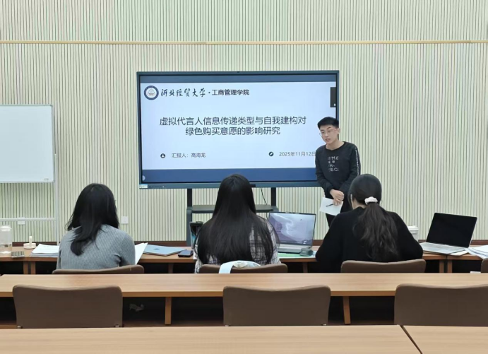 汇报人高海龙以“虚拟代言人信息传递类型与自我建构对绿色购买意愿的影响研究”为题。从引言,理论基础,研究假设,研究设计,结论与展望五部分展开汇报。基于SOR理论和社会反应理论,探索了虚拟代言人信息传递类型与自我建构对绿色购买意愿的交互影响机制。为企业应用虚拟代言人,提升绿色营销能力提供了实证支持。
