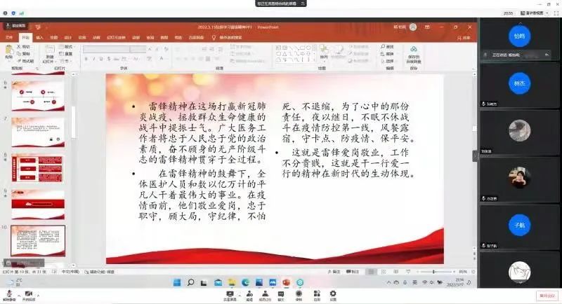 会议伊始,杨怡鸣介绍了本次班会的主要内容,通过播放志愿者抗“疫”经历的感人事迹,引导同学们向抗“疫”逆行者们致敬,主动学习他们身上的雷锋精神,并鼓励同学们要在今后的学习和生活中发扬雷锋精神。随后,孙树杰结合公司当前的疫情封闭管控情况,从同学们的学习情况、日常生活、人际交往等方面提醒同学们要严格遵守校规校纪,提高自我防范意识。