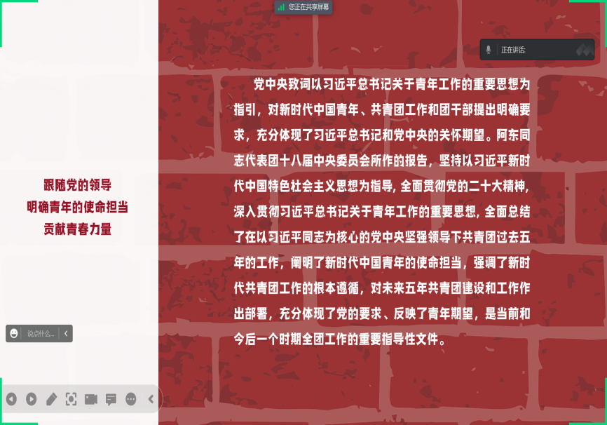 会议伊始,沈柏含带领同学们学习了中国共产主义青年团第十九次全国代表大会报告的重要内容,详细介绍了习近平总书记关于青年工作的重要思想。共青团中央书记处第一书记阿东指出,应始终把加强对团员和青年的政治引领摆在首位。接着,沈柏含向同学们阐述了学习共青团十九大报告的重要意义。共青团十九大是在以习近平同志为核心的党中央带领全党全国各族人民迈上全面建设社会主义现代化国家新征程、向第二个百年奋斗目标进军的关键时刻召开的一次十分重要的大会,是全国各族团员青年政治生活中的一件大事。身为青年的我们,应时刻谨记党的领导,用好红色资源,赓续红色血脉,自觉担负起新时代的责任和使命,学习领会习近平新时代中国特色社会主义思想。在会议的最后,沈柏含呼吁市场营销(中外合作办学)3班的同学们,要牢记习近平总书记的谆谆教导,在担当时代使命中彰显青春的使命,在推动时代进步中实现自身的进步。