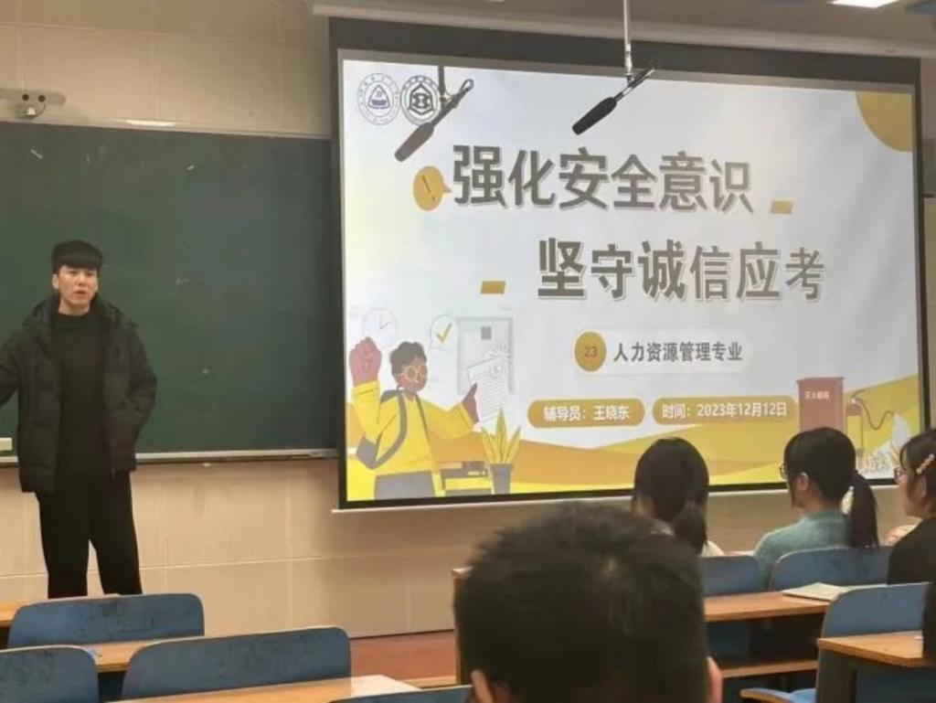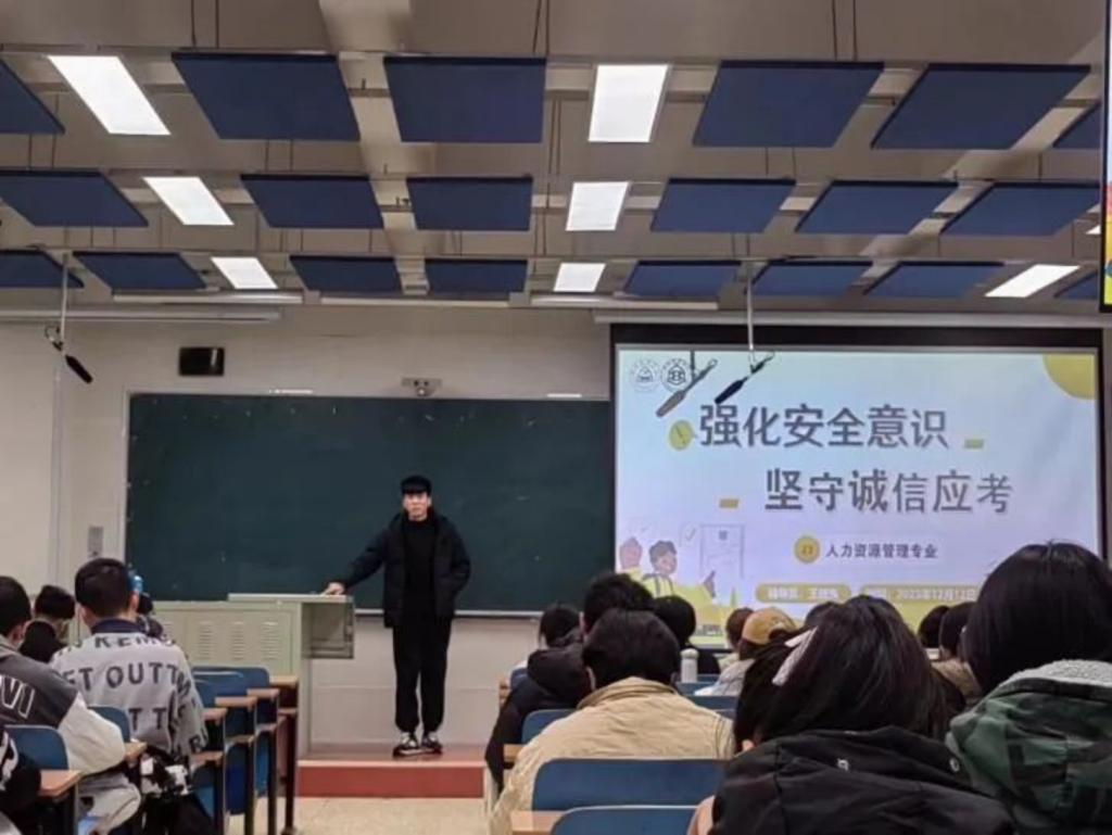 为进一步提高同学们的安全意识和诚信意识,加强考试管理,推动营造公平公正的考试环境,12月12日下午,365英国在线体育人力资源管理专业2023级开展“强化安全意识,坚守诚信应考”主题班会。本次班会由辅导员王晓东老师策划主持,2023级人力资源管理专业全体同学参加。