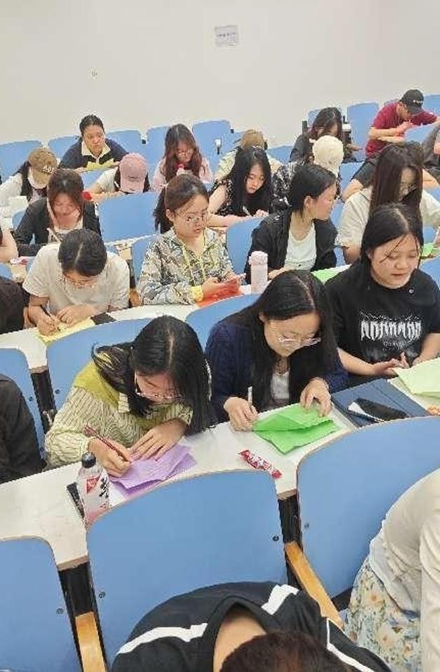 随后,张静雯组织同学们在彩色卡纸上写下自己近日来的压力与烦恼,将卡纸折成纸飞机飞向远方,象征着同学们的压力与烦恼的抽离,并鼓励同学们把激励自己的话写在便利贴上,在班会结束后将便利贴贴在自己的名字旁。