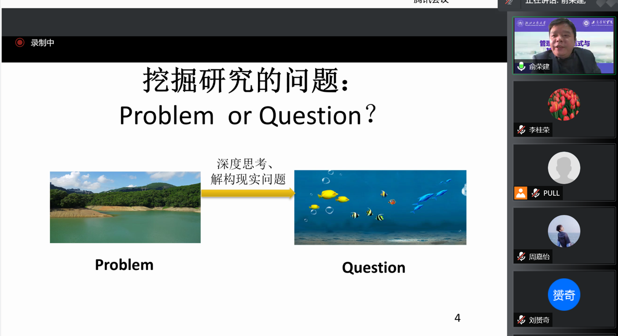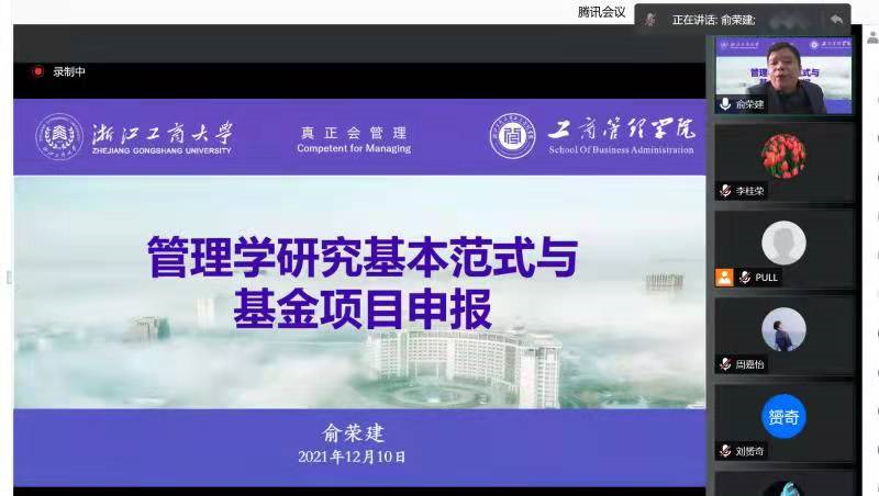 12月10日下午,365英国在线体育邀请浙江工商大学管理公司经理、全球价值链研究中心主任、国家社科重大招标项目首席专家俞荣建教授作题为《管理学研究基本范式与基金项目申请》的学术报告。报告以腾讯会议形式进行,近100名师生参加,365英国在线体育经理李桂荣教授主持了报告会。