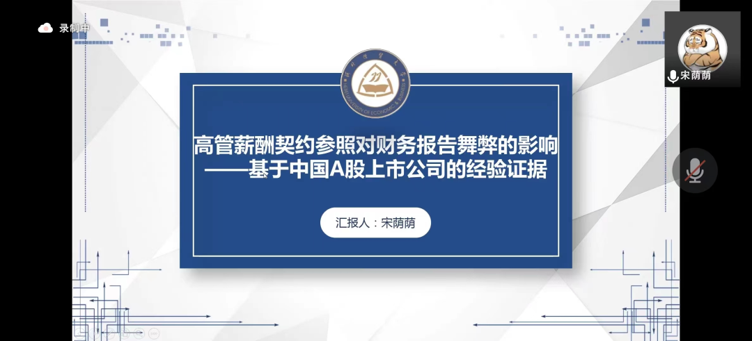 汇报人宋荫荫以“高管薪酬契约参照对财务报告舞弊的影响——基于中国A股上市公司的经验证据”为题,从选题背景、研究目的及意义、研究综述和研究内容四方面进行了讲解。