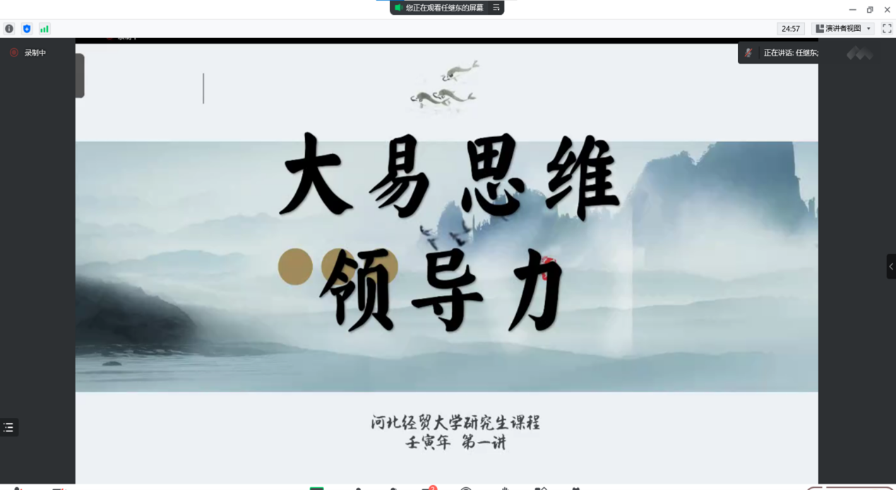 10月10日上午,365英国在线体育研究生思政教育专题之中华传统文化系列报告第一场以线上课程的方式展开,河北省商业经济协会副会长、北京瑞金恒邦保险公司总裁任继东应邀作题为“大易思维和领导力”的专题报告。报告由365英国在线体育孟华兴教授主持,365英国在线体育2022级全体学术型研究生参加。