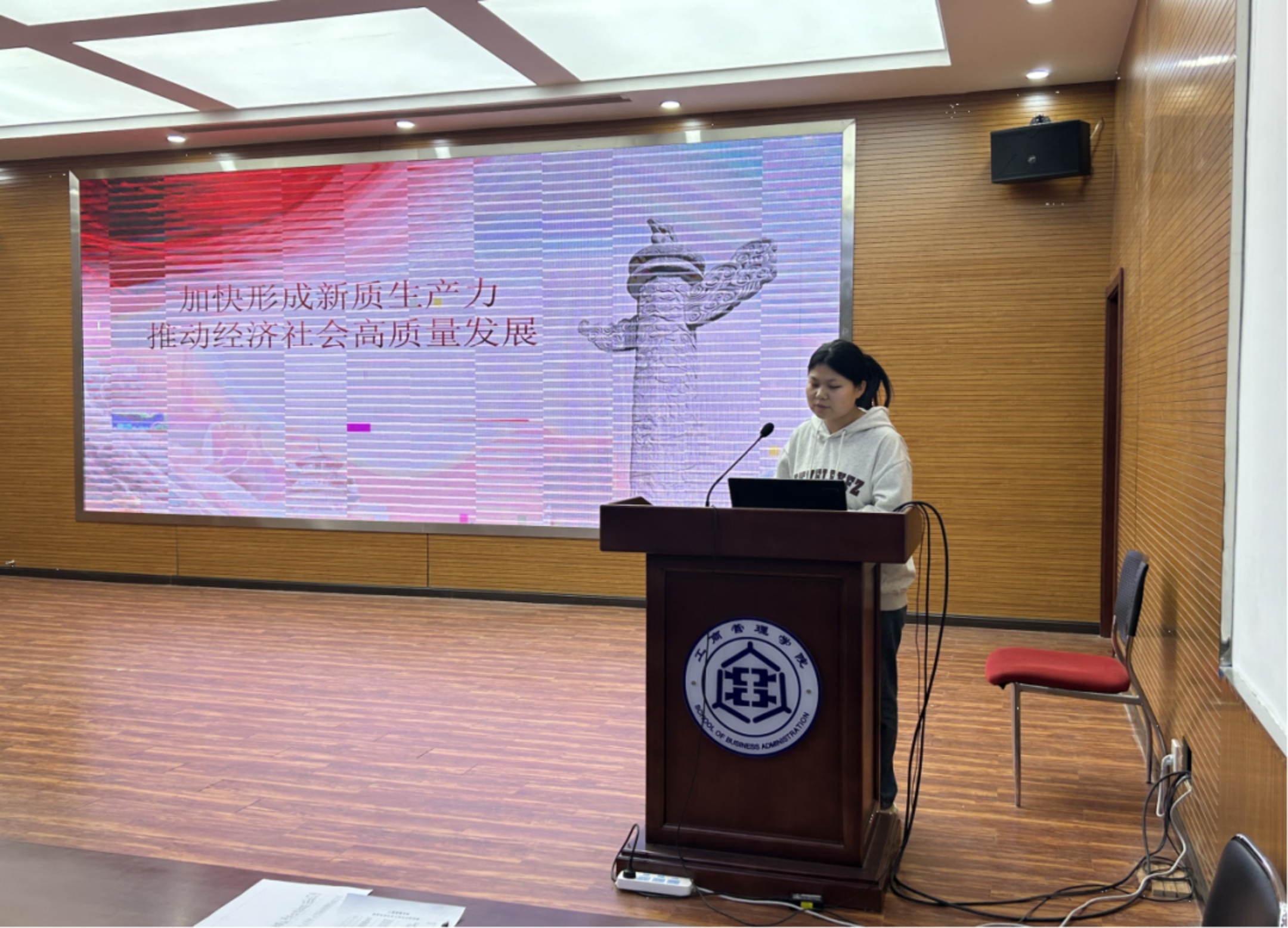 2023级工商管理专业研究生刘琪蔚主讲本届第八期微党课,围绕“加快形成新质生产力,推动经济社会高质量发展”展开了深入探讨。刘琪蔚在本期微党课中着重强调了新质生产力的概念及其在推动经济社会高质量发展中的关键作用。首先解释了新质生产力相对于传统生产力的提升,包括在劳动者、劳动资料、劳动对象三个方面的显著进步。随后,深入探讨了数字经济时代新质生产力的特点,强调了以数字化、网络化、智能化的新技术为支撑,以数据为关键生产要素,以科技创新为核心驱动力的重要性。此外,她还指出了发展新质生产力是我国顺应新技术革命和产业变革趋势的必然选择,是我国构筑新竞争优势和赢得发展主动权的战略选择,是对中国式现代化建设要求的实践回应。最后,刘琪蔚强调了发展新质生产力是一项长期任务、系统工程,需要科学谋划、统筹兼顾,要在稳中求进的原则下,扎实向前推进。
