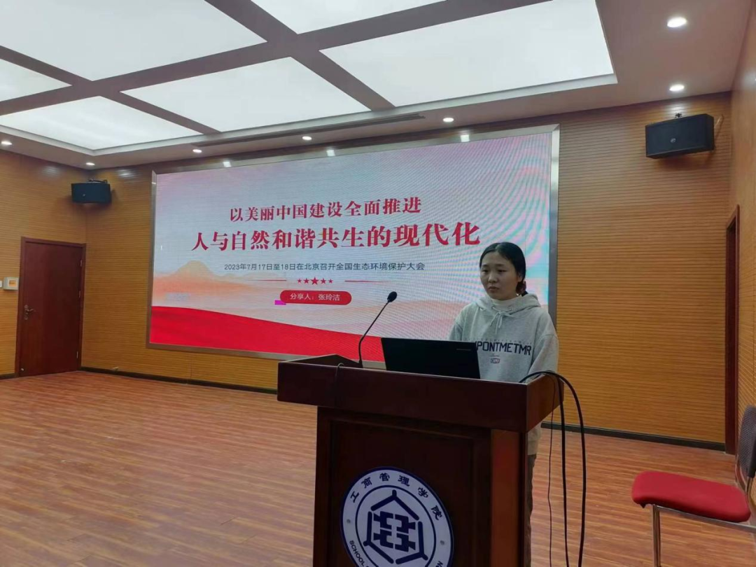 2023级工商管理专业研究生张玲洁作为主讲人,深入探讨了“以美丽中国建设全面推进人与自然和谐共生的现代化”这一主题。张玲洁的演讲不仅加深了同学们对生态文明建设的理解,还激发了他们对于推动人与自然和谐共生现代化进程的热情。首先引用了二十大报告的内容,明确了到2035年我国发展的总体目标,其中包括“广泛形成绿色生产生活方式,碳排放达峰后稳中有降,生态环境根本好转,美丽中国目标基本实现”。她强调,这些目标的实现,需要每一位公民的参与和努力,尤其是即将步入社会的研究生们。接着,引用习近平总书记的讲话,强调要统筹各领域资源,汇聚各方面力量,打好法治、市场、科技、政策“组合拳”,为美丽中国建设提供基础支撑和有力保障。最后,张玲洁指出,人不负青山,青山定不负人。每个人都要做生态文明建设的实践者、推动者,促进人与自然双向奔赴、和谐共生。