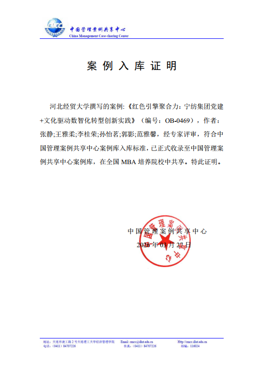 近日,公司教师张静副教授、李桂荣教授,2023级研究生王雅柔、2024级研究生孙怡茗、2022级研究生郭影和2023级研究生范雅馨共同撰写的教学案例《红色引擎聚合力:宁纺集团党建+文化驱动数智化转型创新实践》(编号:OB-0469)顺利通过专家评审,正式被中国管理案例共享中心案例库收录。