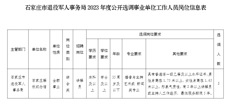 石家庄市退役军人事务局公开选调2名工作人员。具体招聘人数和岗位条件详见↓↓↓