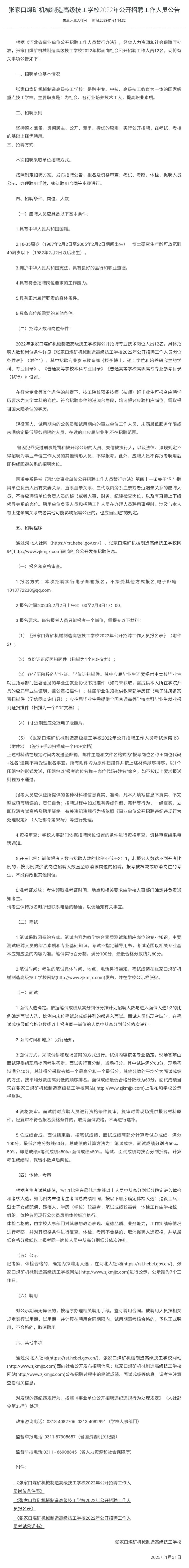 张家口煤矿机械制造高级技工公司2022年拟面向社会公开招聘工作人员12名。具体招聘人数和岗位条件详见↓↓↓