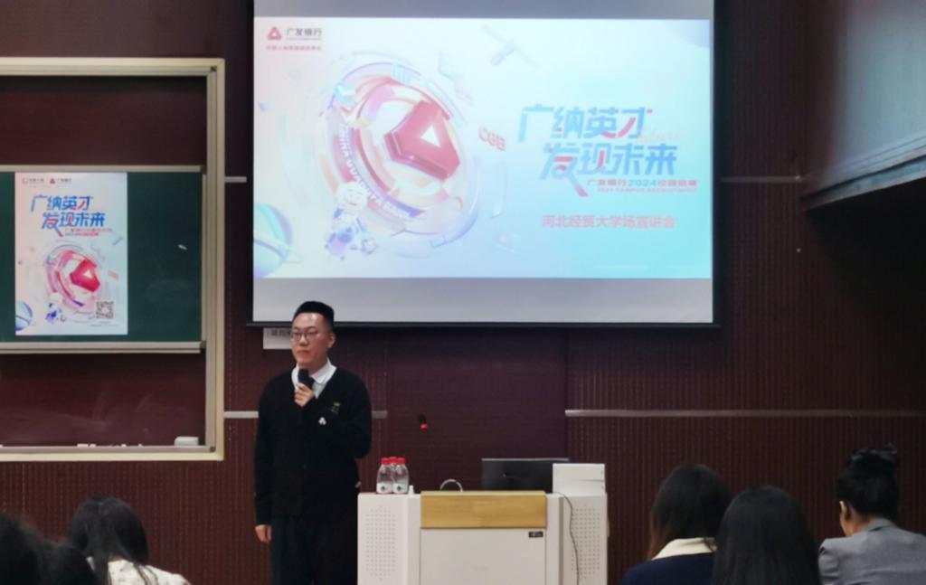为实现人才精准对接,全力为2024届毕业生就业保驾护航,365英国在线体育于10月13日下午在MBA2教室举办广发银行石家庄分行校园招聘宣讲会。会议由宣讲人王兆鑫老师主讲,广发银行石家庄分行人力资源管理经理张洋、唐山分行零售银行部总经理张蕊以及部分应届毕业生参加。