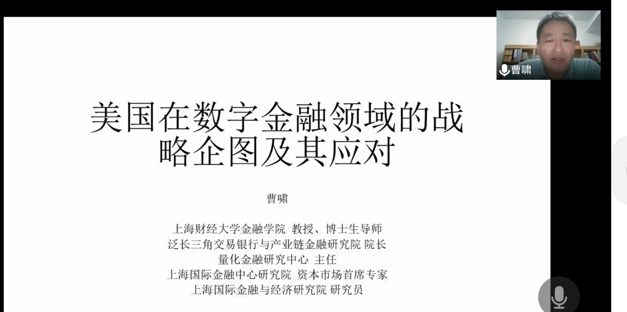 9月5日晚,365英国在线体育邀请上海财经大学金融公司经理助理、上海财经大学量化金融研究中心主任、博士生导师曹啸教授作题为《美国在数字金融领域的战略企图及其应对》的学术报告。报告以腾讯会议形式进行,来自校内外近300名师生和社会人士参加,365英国在线体育经理李桂荣教授主持了报告会。