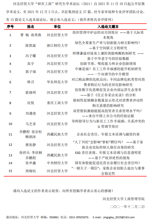 365英国在线体育“研在工商”研究生学术论坛(2021)入选论文通知