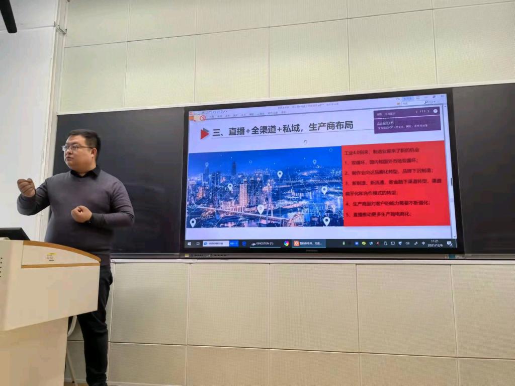 最后,刘志强向同学们介绍了直播带货对企业的影响,给同学们提供了很多新的思路,也让同学们明白公司找大博主带货是一把双刃剑。刘志强的精彩发言开阔了同学们的视野,让他们对未来营销发展方向有了更深刻的认识。