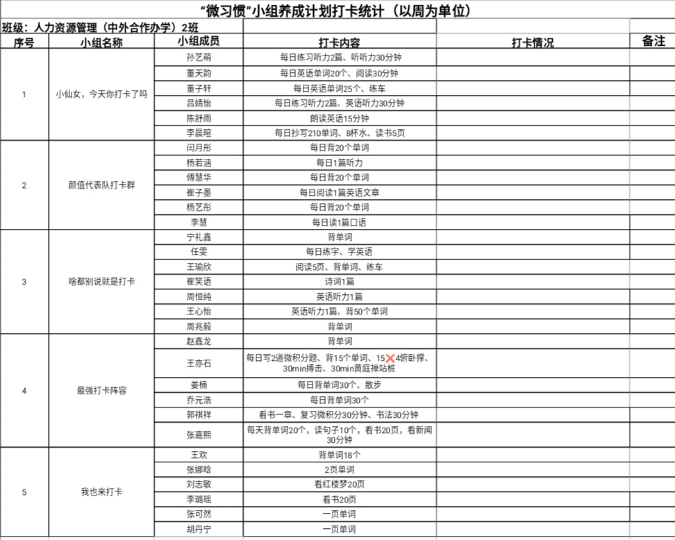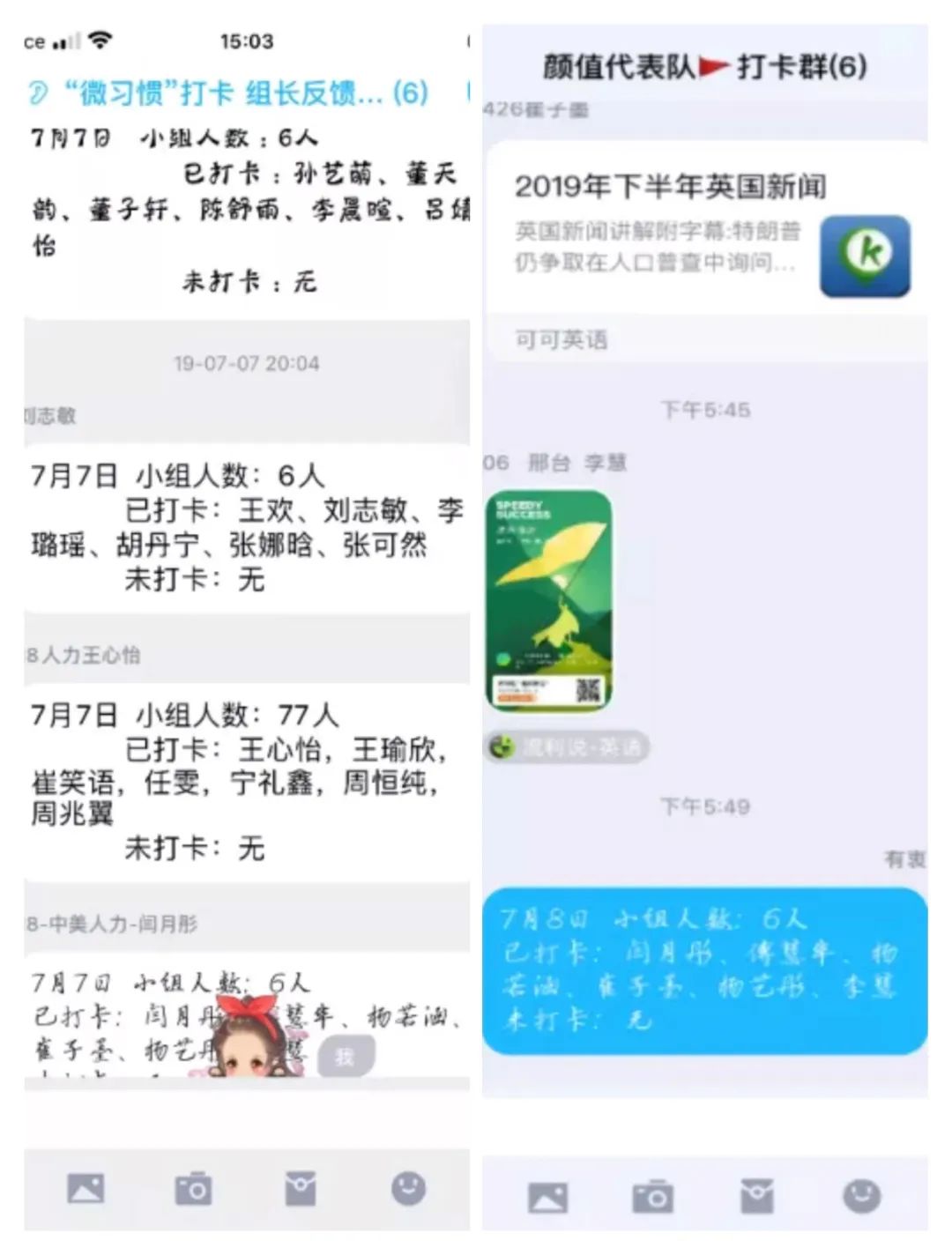 (三)深入互动促发展,“打卡”开创新局面。“不积跬步,无以至千里;不积小流,无以成江海”。习惯的养成从小事开始,就不会觉得困难。因此,为进一步帮助老员工培养良好的习惯,提高自我约束力,积极面对假期生活,支部开展假期学习小组打卡习惯养成活动。该活动以宿舍为一个小组,每个小组设一名组长,每个宿舍建立打卡QQ群,小组成员每天在QQ群里打卡,组长每天收集小组成员的打卡情况并以周为单位汇总汇报。