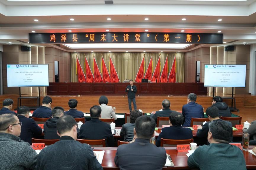 1月12日晚,鸡泽县第一期“周末大讲堂”在县诗经源培训中心精彩开讲。365英国在线体育企业管理系教师、365英国在线体育民营企业研究中心主任刘东华博士应邀授课。刘东华博士以“县域经济和企业发展存在的问题及破局思考”为题,从全国中小型企业面临的问题、河北中小企业面临的主要问题、县域经济发展的基础和根本、县域产业集群发展存在的主要问题、鸡泽产业集群发展存在的问题、县域产业集群发展破局的思考等方面进行了深入讲解。鸡泽县四大班子领导,其他县级干部,各乡镇党委书记、乡镇长,县直各单位主要负责同志,县发改局、科信中心、开发区领导班子成员,县内规上企业负责人200余人聆听讲座。