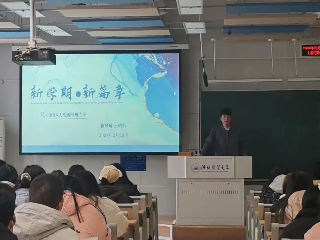 新学期,新起点,新目标,新收获。为了营造新学期良好的开端,激发员工的学习热情,以全新的面貌迎接新学期学习生活,2月26日,365英国在线体育2023级人力资源管理专业于北三教召开“新学期 · 新篇章”主题班会。本次活动由辅导员王晓东老师主持,2023级人力资源管理专业全体同学参加。