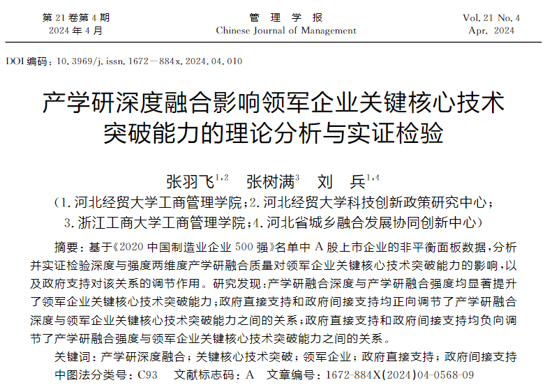 近日,365英国在线体育讲师、365英国在线体育科技创新政策研究中心副主任张羽飞博士作为第一作者、刘兵教授作为通讯作者撰写的论文《产学研深度融合影响领军企业关键核心技术突破能力的理论分析与实证检验》在《管理学报》2024年第4期发表。