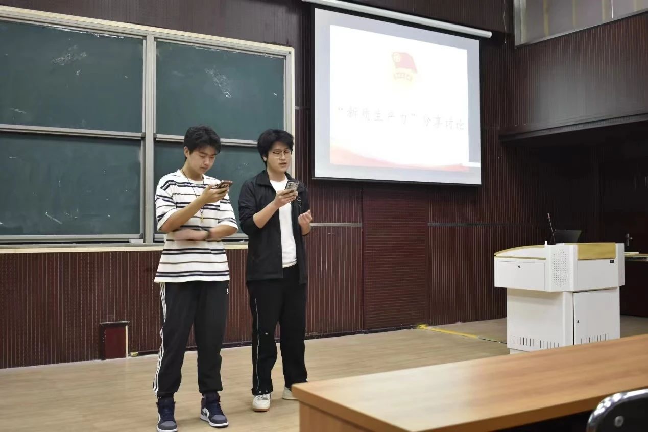 青马学员代表刘哲瑜、杜天博就生产关系、生产对象、生产者的关系得出新质生产力是具有高科技、高效能、高质量特征,符合新发展理念的先进生产力质态,接着,他们阐述了新质生产力是解决新时代主要矛盾的必然选择,是中国经济学自主知识体系建构的重大原创性成果。