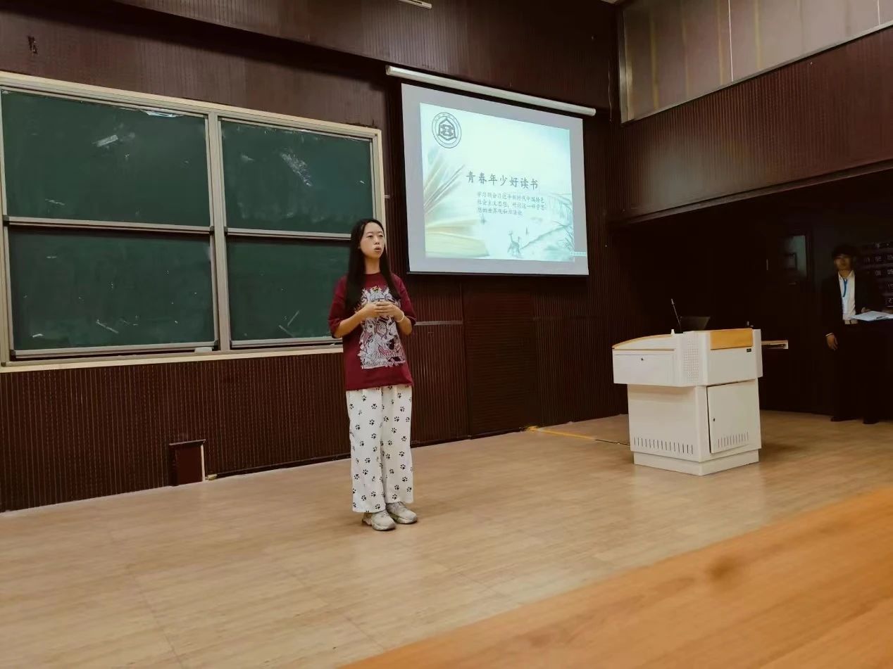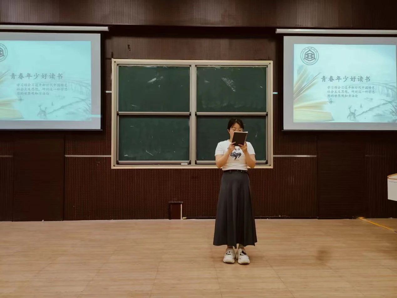青马学员代表何睦、王赫、李瑞希、陈彦廷、郭语嫣从读好书、好读书、读书好三个板块,结合记忆曲线解释了青年为什么要读书的问题:读书可以提升我们的文化内涵、思想和灵魂,拓宽我们的视野,带来精神上的动力。同时,学习马克思主义经典著作,必须在结合实际的同时以我们正在做、应该做的事情为中心,从而解决中国特色社会主义建设中的新问题,推进中国特色社会主义事业的发展。
