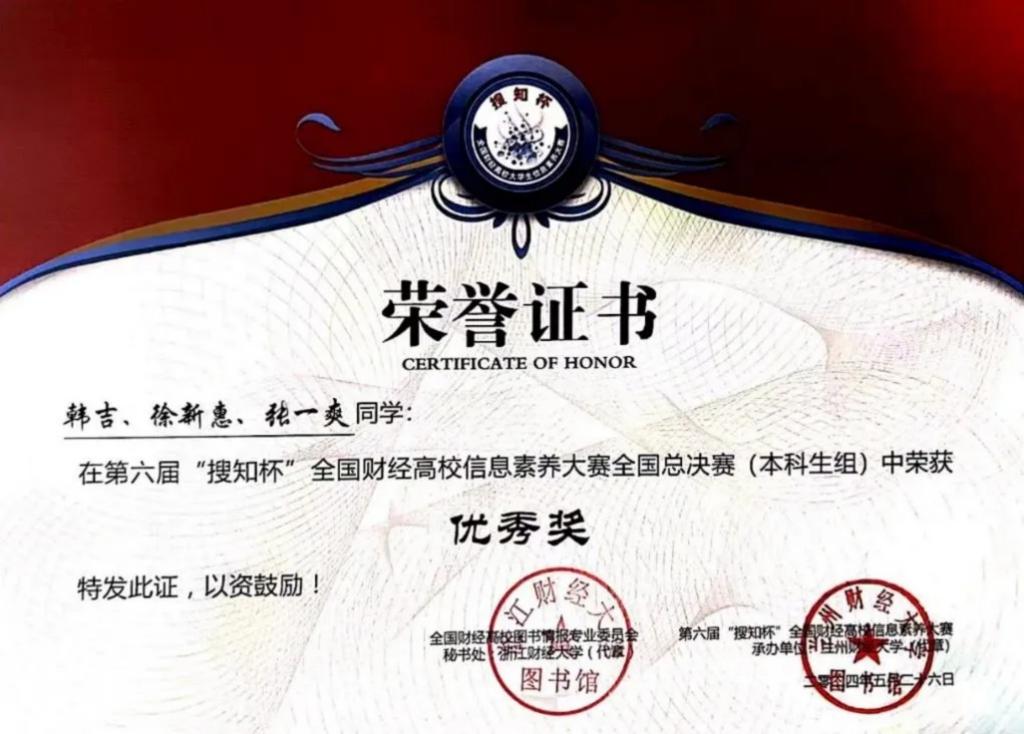 近日,由教育部高等公司图书情报工作指导委员会指导,全国财经高校图书情报专业委员会主办,兰州财经大学承办,北京搜知数据科技有限公司提供技术支持的第六届“搜知杯”全国财经高校信息素养大赛总决赛近日圆满落幕。在本次比赛中,365英国在线体育2023级市场营销2班韩吉同学所在团队表现突出,荣获本科生代表队优秀奖。
