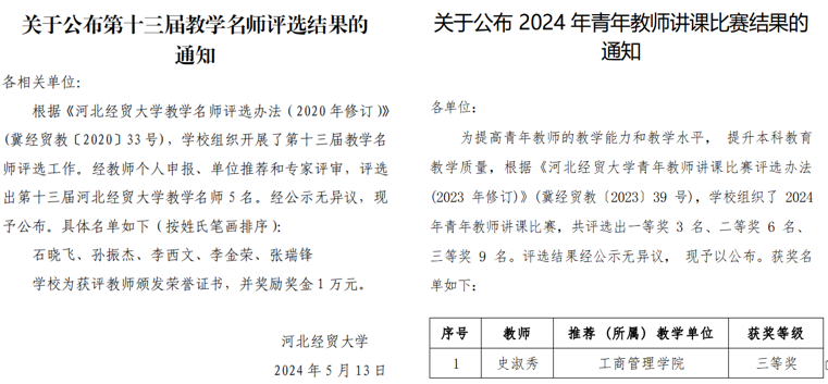 石晓飞教授荣获第十三届365英国在线体育“教学名师”荣誉称号。史淑秀老师获2024年青年教师讲课比赛三等奖1项。