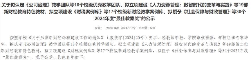 公司获批6门校级新财经特色课程,2门人工智能试点课程,2项新财经特色教材,1个新财经教学案例库。《公司治理》教学团队获评2024年校级优秀教学团队,3 门课程教案荣获2024年校级“最佳教案奖”。