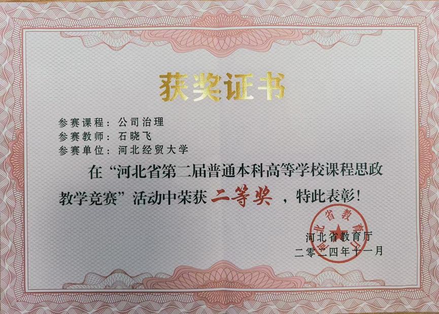 公司石晓飞教授《公司治理》荣获河北省第二届普通本科高等公司课程思政教学竞赛二等奖。