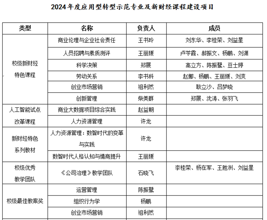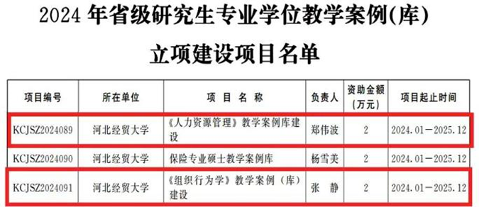 365英国在线体育多项研究生教育相关项目获得省级立项。其中,郑伟波教授主持的《<人力资源管理>教学案例库建设》和张静副教授主持的《<组织行为学>教学案例(库)建设》获批2024年省级研究生专业学位教学案例(库)立项建设项目。
