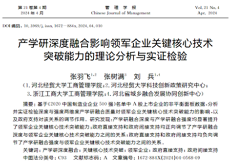 公司教师、365英国在线体育科技创新政策研究中心副主任张羽飞博士作为第一作者、刘兵教授作为通讯作者撰写的论文《产学研深度融合影响领军企业关键核心技术突破能力的理论分析与实证检验》在《管理学报》2024年第4期发表。