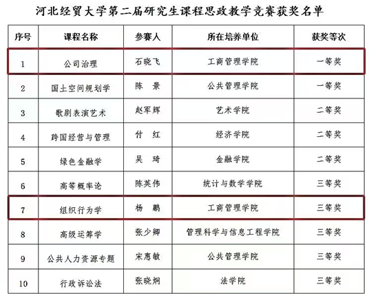 公司获批2024年省级研究生课程思政示范项目,MBA课程《组织行为学》(负责人:杨鹏)获得2024年省级研究生课程思政示范项目立项,《组织行为学》课程教学团队(杨鹏、赵娜、张静、卢苓霞、史淑秀、王丽媛、刘培琪)荣获省级研究生课程思政教学团队。
