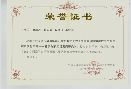 公司教师应邀参加第七届(2024)网络平台治理暨第九届网络治理青年学者论坛。公司教师的合作论文《破茧成蝶:新创数字平台克服资源限制构建数字生态系统的演化研究--基于数梦工场案例研究》入选分论坛“组织创新与新质生产力”分论坛并获优秀推荐论文。