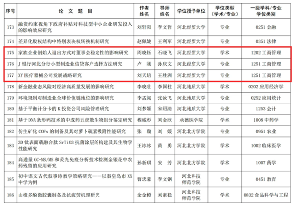 365英国在线体育3篇论文荣获2021-2022学年度河北省优秀硕士学位论文、河北省优秀硕士论文。分别是2022届毕业生周晓钰(导师:石晓飞)的学位论文《家族企业创始人退出方式对董事会稳定性的影响研究》、卢刚(导师:孙庆文)的学位论文《J银行河北分行小型制造业信贷客户选择方法研究》、刘天培(导师:王胜洲)的学位论文《XY医疗器械公司发展战略研究》。
