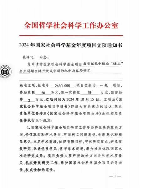 365英国在线体育吴林飞博士主持的《数智赋能制造业“链主”企业引领全链开放式创新的机制与路径研究》项目获国家社科基金一般项目立项。