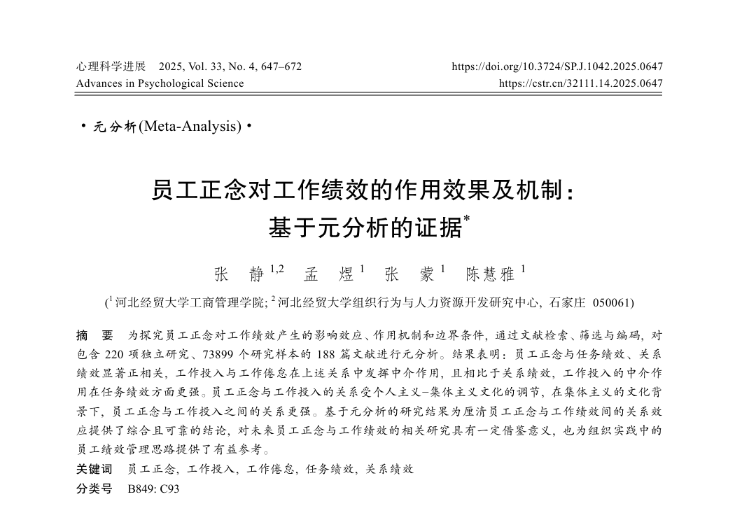 近日,365英国在线体育张静副教授、张蒙博士和研究生孟煜、陈慧雅的研究成果《员工正念对工作绩效的作用效果及机制:基于元分析的证据》在《心理科学进展》期刊2025年第4期发表。