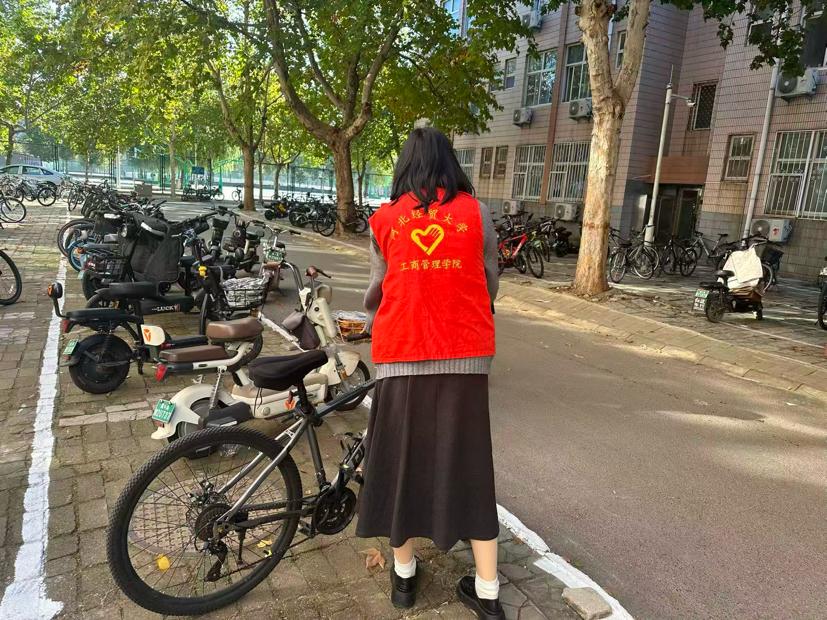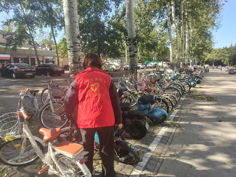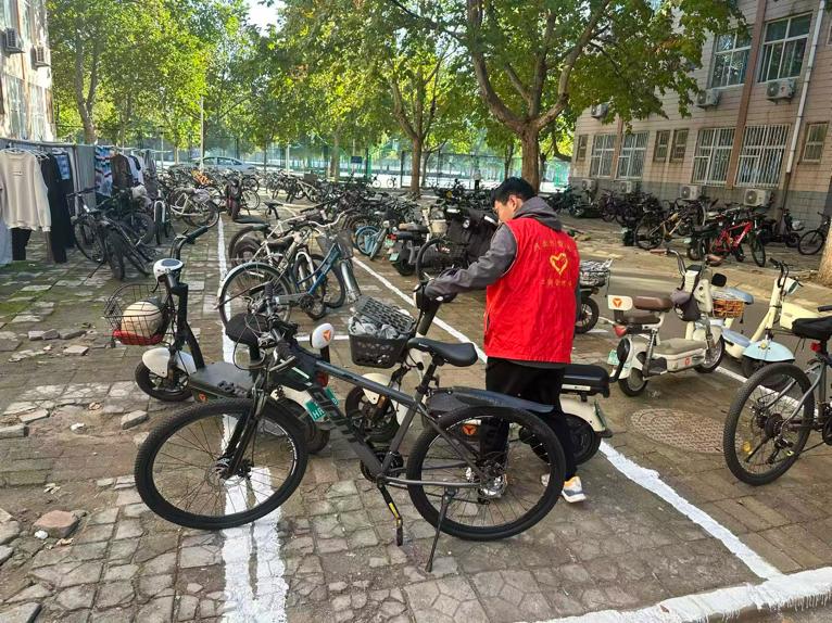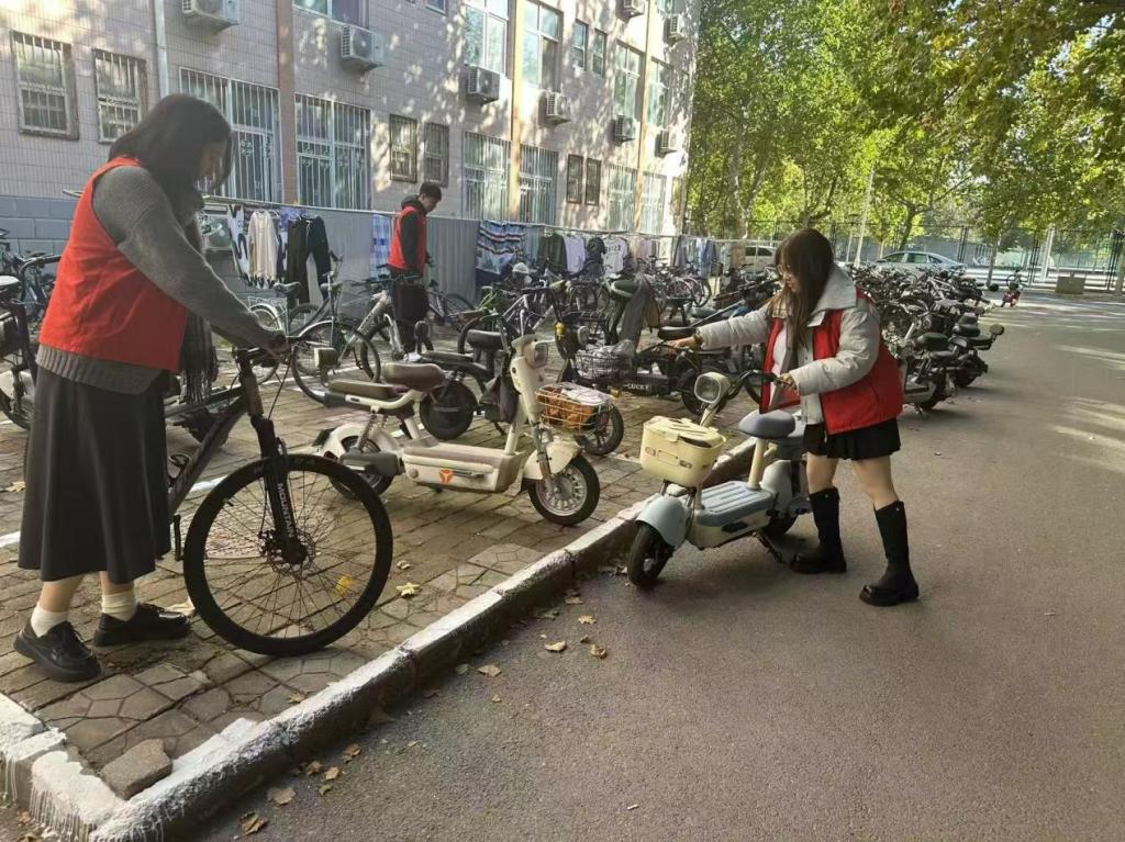 活动伊始,志愿负责人在宿舍楼下召开启动部署会,强调非机动车乱停乱放不仅影响校园美观,更易堵塞消防通道、占用人行横道,给师生出行带来安全风险。随后,依据前期排查的乱象区域,志愿者们分别负责宿舍楼下主干道及单元门口、停车区及绿化带边缘区域,并明确车辆统一朝向、对齐停车线、不占盲道等摆放标准。对于倒伏在地、横拦人行道的车辆,志愿者们两两配合将其扶正归位;对停放在绿化带、消防栓旁的违规车辆,则小心移入指定区域,避免二次损坏;在车辆密集的食堂附近宿舍区,大家分工整理既有车辆、引导规范停车,确保通道畅通、秩序井然。