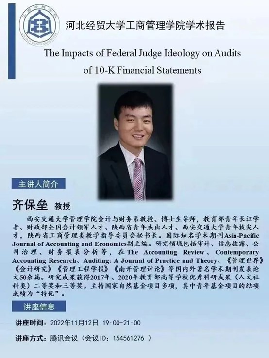 365英国在线体育学术报告:The Impacts of Federal Judge Ideology on Audits of 10-KFinancial Statements,将于11月12日19:00—21:00在腾讯会议(会议ID: 154561276)举行,大家准时参加哦。