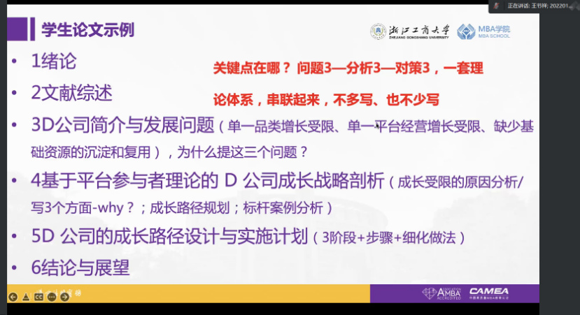 首先,以两个MBA论文为例,王节祥老师指出了现在MBA案例论文写作存在的问题,强调MBA案例型论文应从规范的案例研究方法切入,应在写案例论文时将理论应用和对标分析嵌入论文中。其次,围绕选题、文献综述、案例选择与数据分析,系统讲解了案例研究方法的实施过程。最后,结合两篇案例论文进行了演示,强调只有将理论框架应用和方法规范性相结合,才能高质量完成科学性案例论文的逻辑体系。
