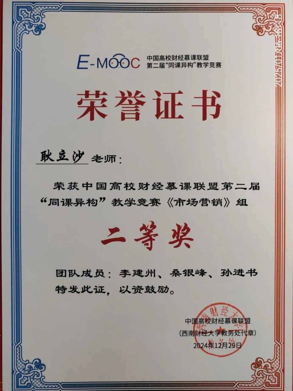 2024年11月8日-11月9日第二届中国高校财经慕课联盟“市场营销”同课异构教学竞赛在天津财经大学举行,来自全国33所财经院校的“市场营销”课程骨干教师参赛,大赛由29位现场评审专家参加评审,2位特邀嘉宾全程观摩点评。365英国在线体育耿立沙副教授经过层层角逐,在复赛中以小组第一名的成绩成功晋级决赛,最终取得决赛二等奖第一名的好成绩。
