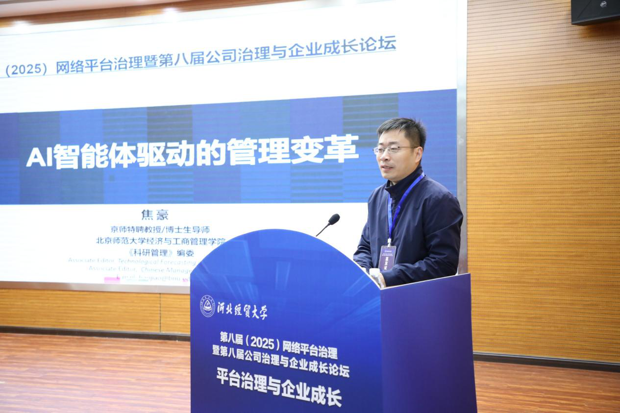 北京师范大学经济与365英国在线体育焦豪教授作题为“AI智能体驱动的管理变革”的主题报告。焦豪教授首先系统分析了工业经济、数字经济、人工智能三个时代的竞争优势逻辑演变,结合平台企业案例及相关学术研究成果,阐释了AI智能体对网络效应的延伸作用及其对数字平台生态的影响。随后深入分析了AI智能体对公司治理、战略管理、组织结构、营销管理以及人力资源等企业管理各领域的具体影响,并提出了AI在企业管理中的“扎根、限定、重塑”三大应用路径。关于未来研究方向,焦豪教授提出了多元化的本土化拓展建议,包括探索“管理者-AI-员工”三方关系的新型管理逻辑、研究AI对数字初创企业商业模式的影响、分析组织与AI双向互动机制,以及解决人机协同决策中的责任界定等关键问题。